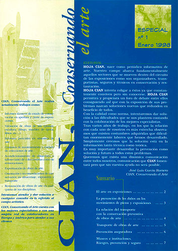 Nuestro lema «Conservando el Arte» es fácilmente aplicable a todas la secciones, desde las colaboraciones en el campo de la conservación, pasando por el interés del transportista en la eficacia de su trabajo y hasta en nuestra nueva sección de crítica de arte. Una sección que nace por que consideramos que el origen y el fin es la creación y por tanto debernos conservar sus ideas ya que son estas las que nos ayudan a vivir. Ejemplos como los de O. Messiaen que compuso su cuarteto para el final de los tiempos dentro de una celda en un campo de concentración alemán, la vida explosiva de un joven Rimbau y un Modigliani moribundo entre belleza son ideas que merecen ser conservadas ,ideas de unos artistas dentro de una sociedad que actúa como rompeolas y que ha creado un status que agrede la propia esencia del hombre.
